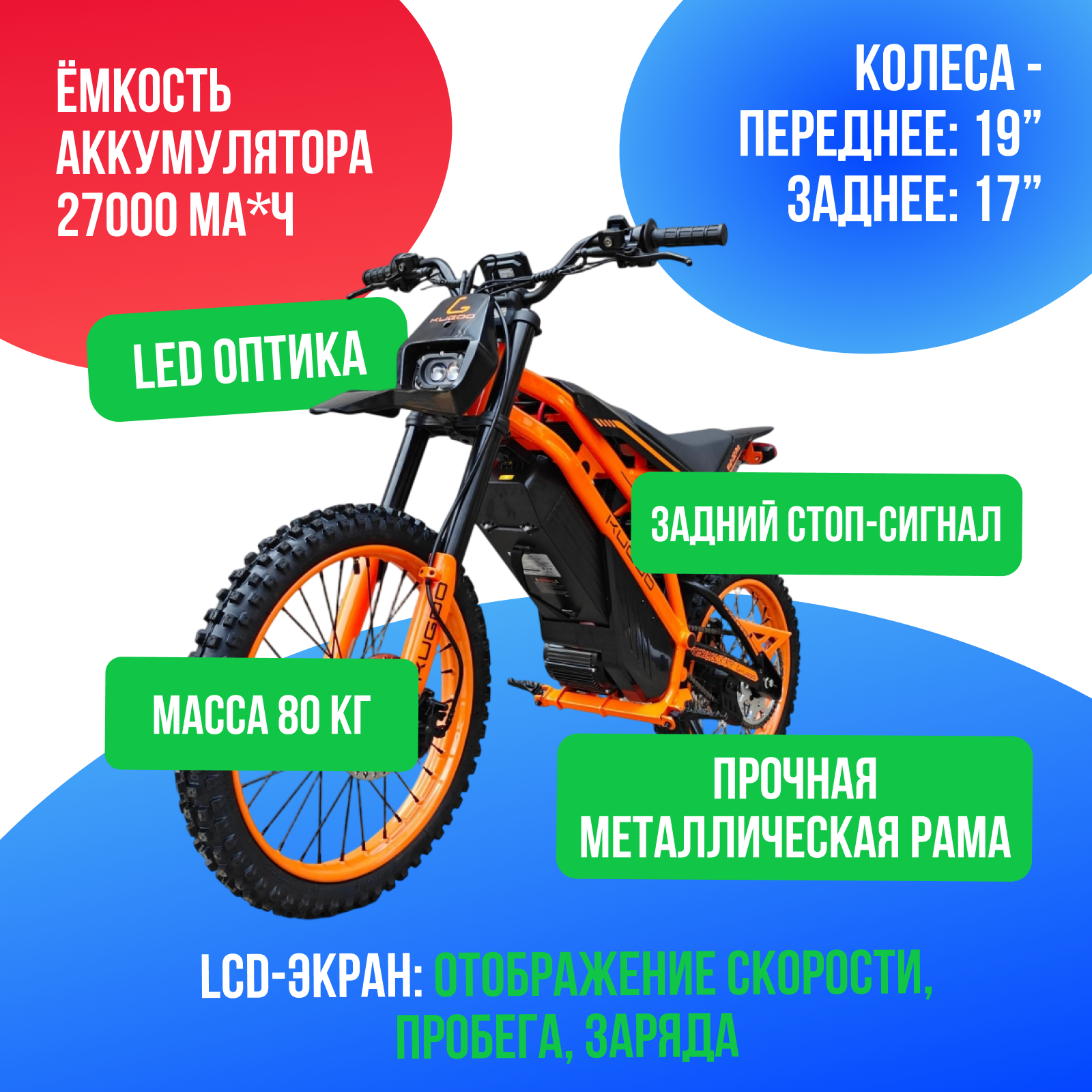 Мощность двигателя составляет 2500 W, что позволяет развивать скорость до 70 км/ч. Емкость аккумулятора 27000 мА*ч дает возможность проехать 60 км без подзарядки. Время полной зарядки — 6 ч ч. Масса электросамоката — 80 кг, а максимально допустимая нагрузка — 150 кг. Диаметр колес 19 дюймов обеспечивает хорошую проходимость.