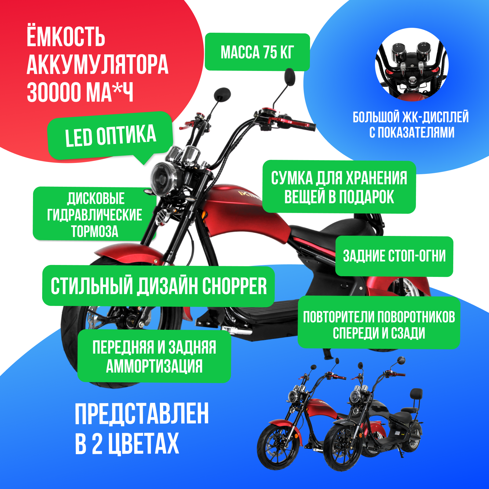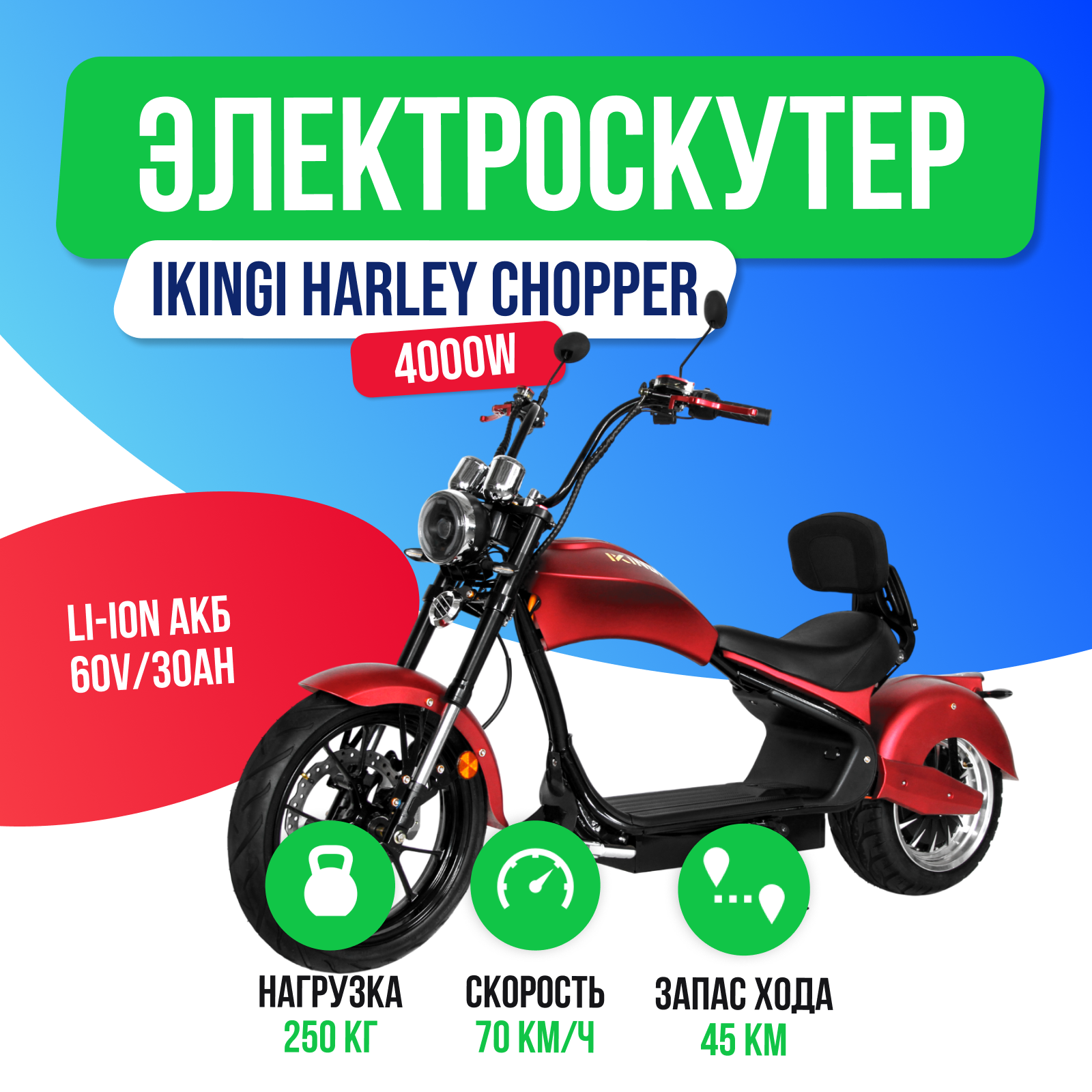 При покупке Электроскутер IKINGI HARLEY CHOPPER 4000W (60V/30Ah) - Красный у нас вы получаете быструю доставку по Москве и РФ и официальную гарантию на 1 год. Возможна срочная доставка. Действует пункт самовывоза. Имеются в наличии запчасти и аксессуары к данной модели.