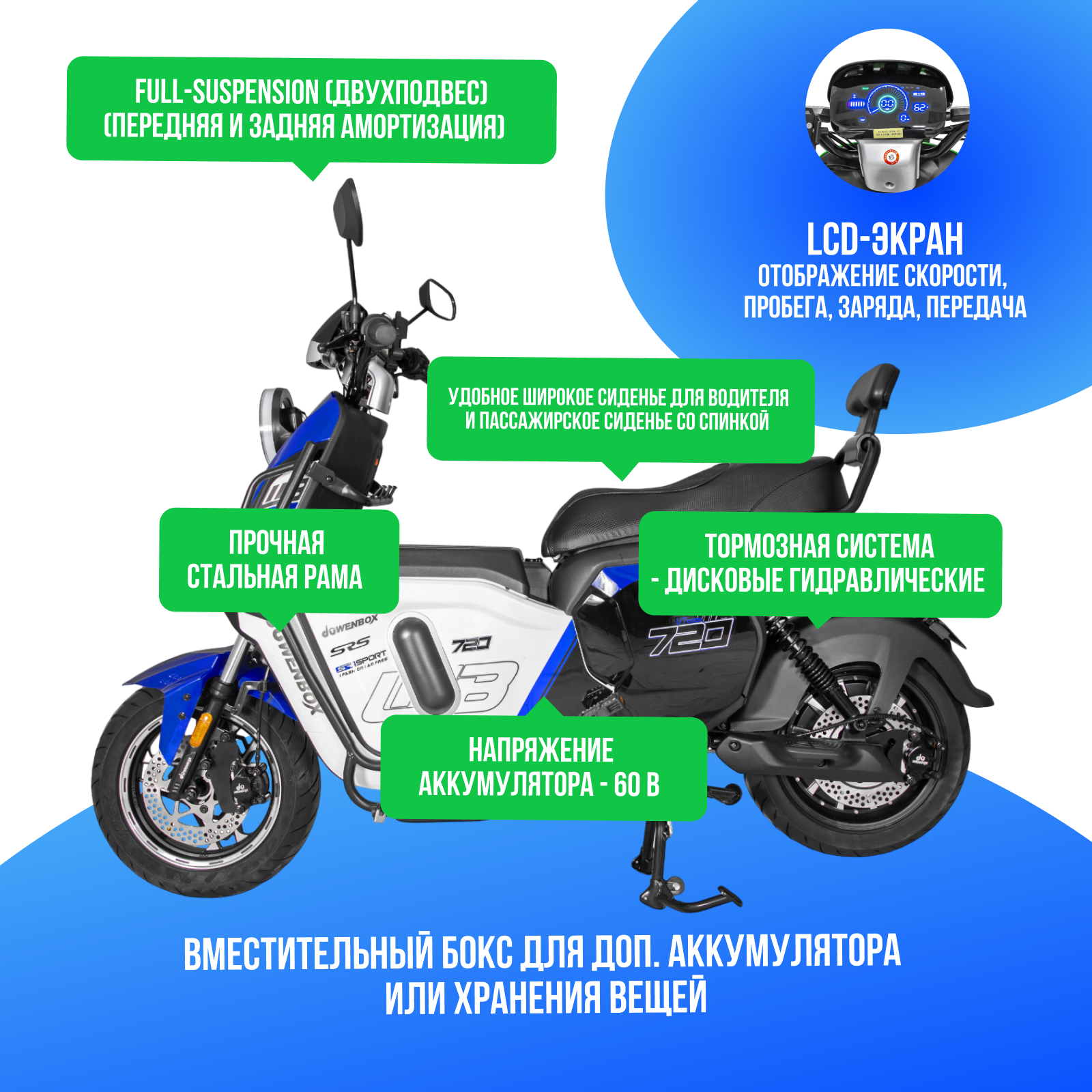 Купить Электроскутер WENBOX U7 1500W (60V/30Ah) - Синий с доставкой по Москве и всей России