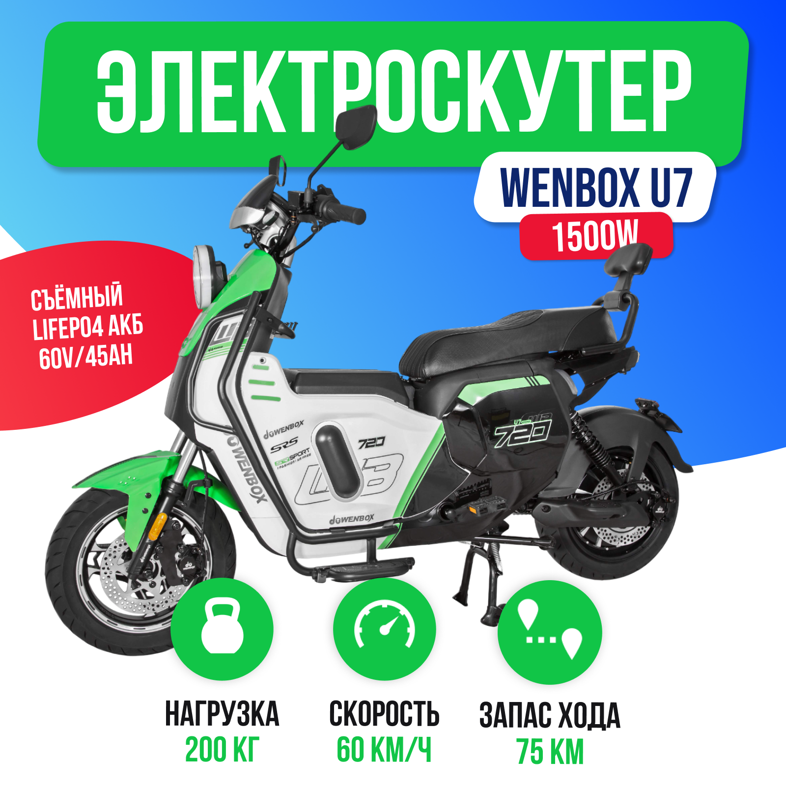 При покупке Электроскутер WENBOX U7 1500W (60V/45Ah) - Зеленый у нас вы получаете быструю доставку по Москве и РФ и официальную гарантию на 1 год. Возможна срочная доставка. Действует пункт самовывоза. Имеются в наличии запчасти и аксессуары к данной модели.