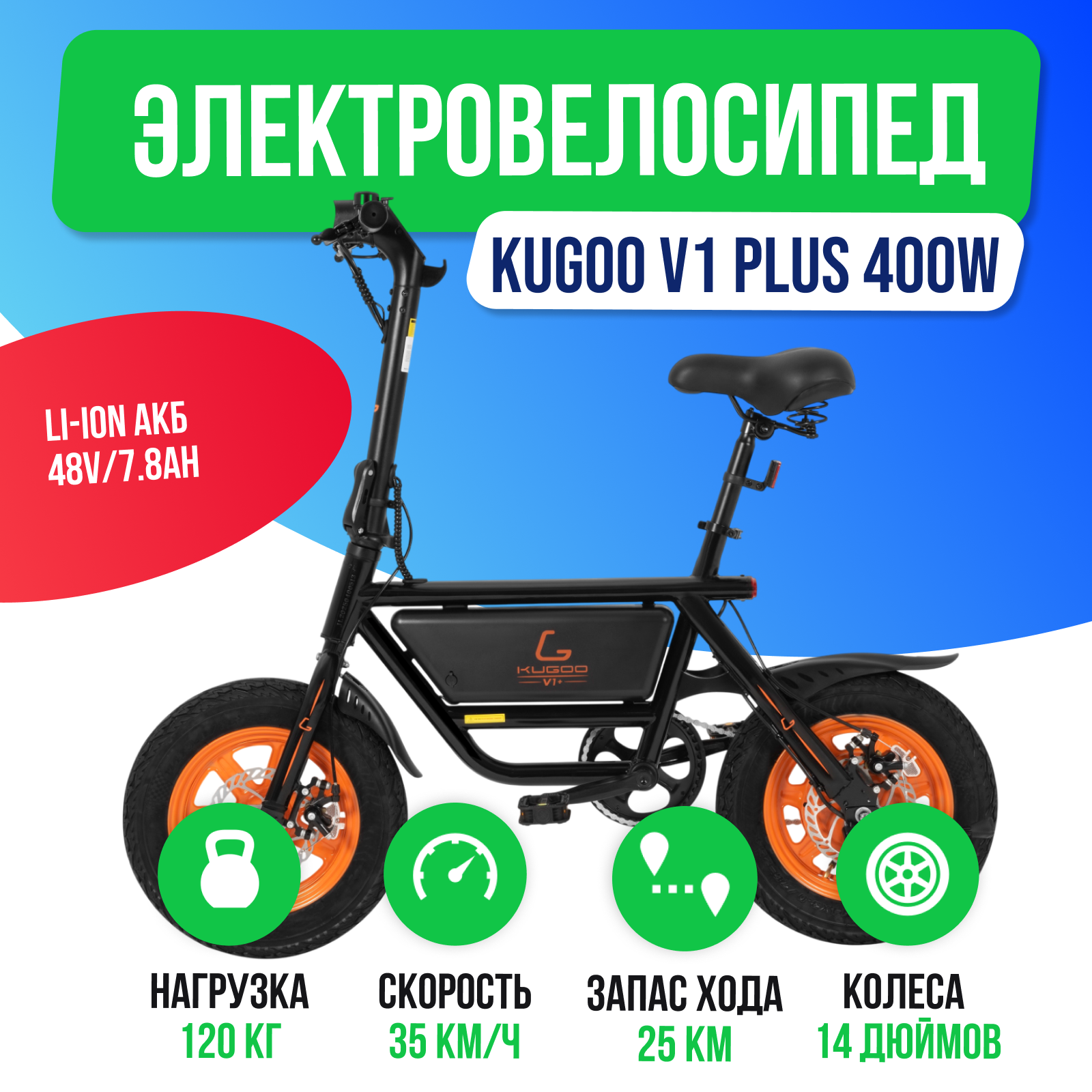 Купить Электровелосипед KUGOO V1 PLUS (48V/7.8Ah) с доставкой по Москве и всей России